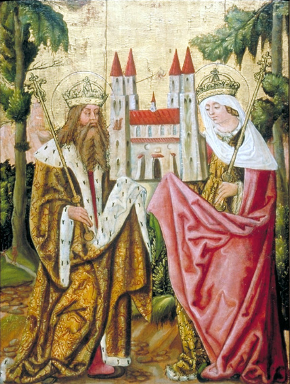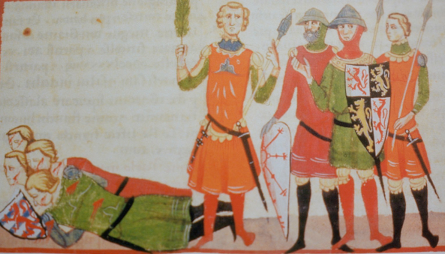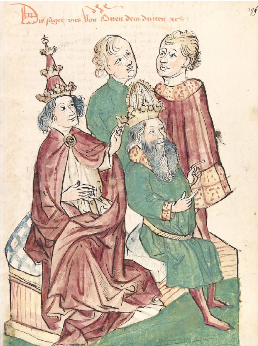 Vlnr. Keizer Otto III, zalving door Paus Gregorius (reg. 983-1002) Keizer Hendrik II met zijn echtgenote Kunigonde, 15de eeuw, Moravian Gallery Brno Isenburg, bisschop van Isenburg, 1198-1250 Overgave bij de slag van Worringen,Reinoud I, graaf van Gelre en Hertog van Limburg 1280-1288, Nuova Cronica - ms. Chigiano L VIII 296 - Biblioteca Vaticana