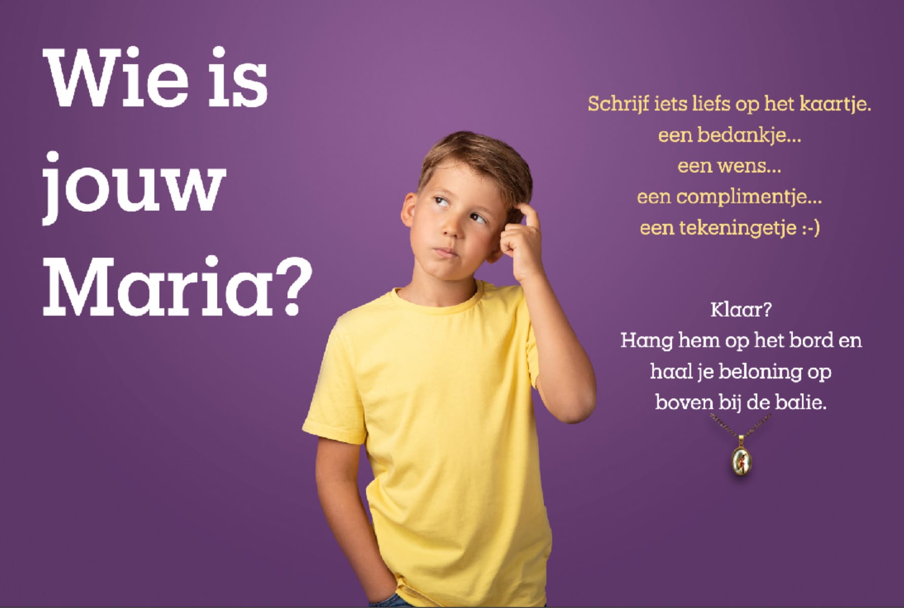 Gelovig of niet? Maria leeft! is toegankelijk voor iedereen. Ook voor kinderen. We hebben een kidscorner waar je een lief berichtje kunt achterlaten en je krijgt een leuk hangertje. Je kunt ook je eigen Maria samenstellen in onze Maria leeft! Collectie.
